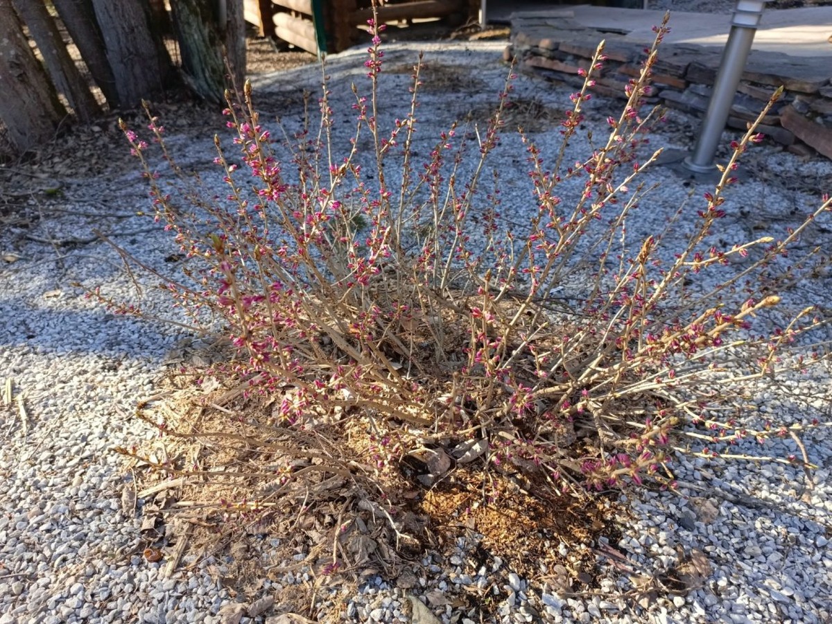 Зацветает волчье лыко у беседки в заповеднике "Кивач". 17.04.2025.