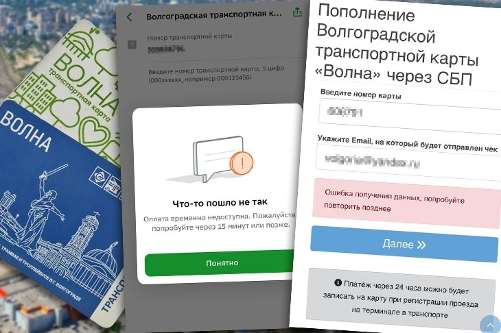Почти сутки в Волгограде невозможно пополнить онлайн транспортную карту «Волна». Об этом V102.RU сообщили местные жители, которые с четверга пытаются положить деньги через мобильное приложение в банке или на официальном сайте транспортной карты «Волна». - Со вчерашнего дня пытаюсь положить деньги на карту всеми возможными дистанционными способами и безрезультатно. В мобильном приложении банка операция не проходит. Через СПБ на сайте транспортного оператора vlg-tk.ru также выдает ошибку, - сообщила информагентству жительница Волгограда Ольга. Напомним, что оператором проекта транспортной карты в Волгограде является ООО «Сити транспорт Групп–Поволжье». В компании подтвердили, что пополнить карту «Волна» пока действительно дистанционно нельзя. - Проводятся технические работы, - пояснили в компании. По предварительным данным, работы продлятся еще пару часов. Пополнить карту онлайн можно будет после обеда. Коллаж V102.RU