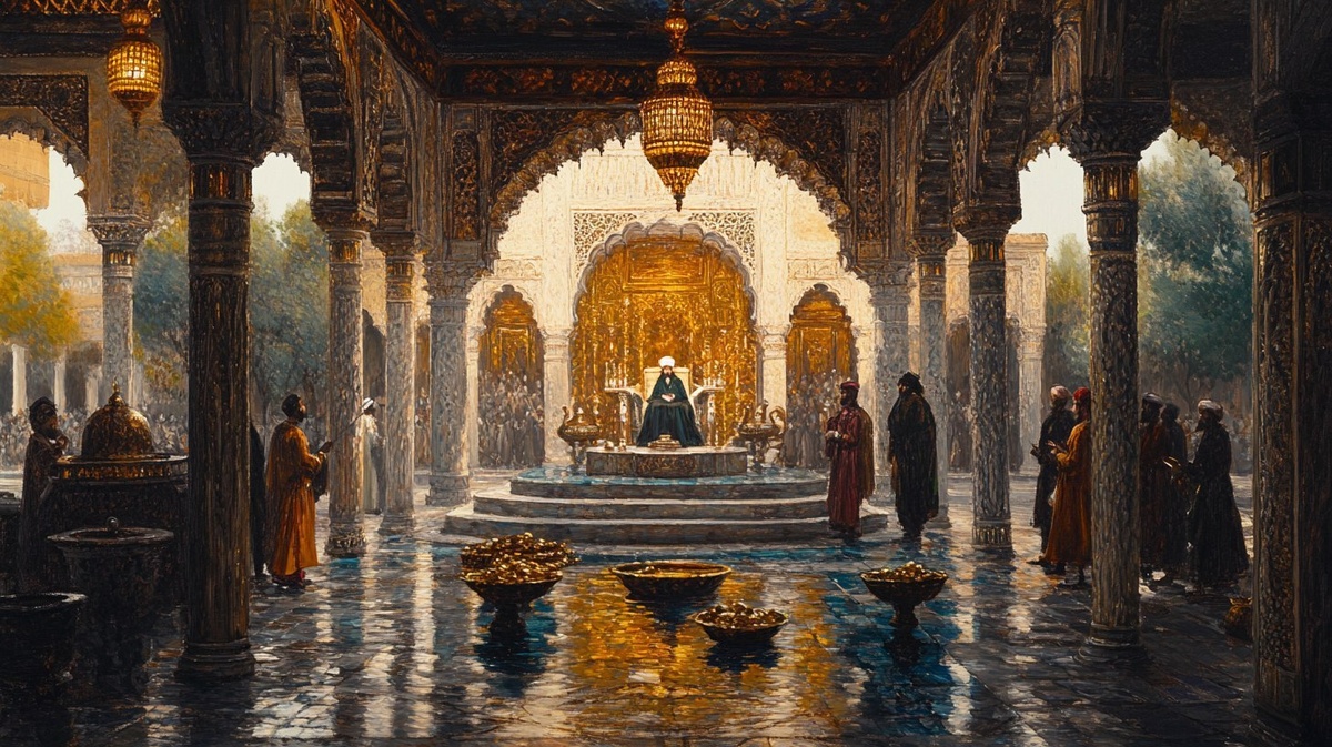 Создано на основе запроса: An opulent oil painting interior of El Badi Palace in its prime: Sultan Al-Mansur seated on a marble throne
