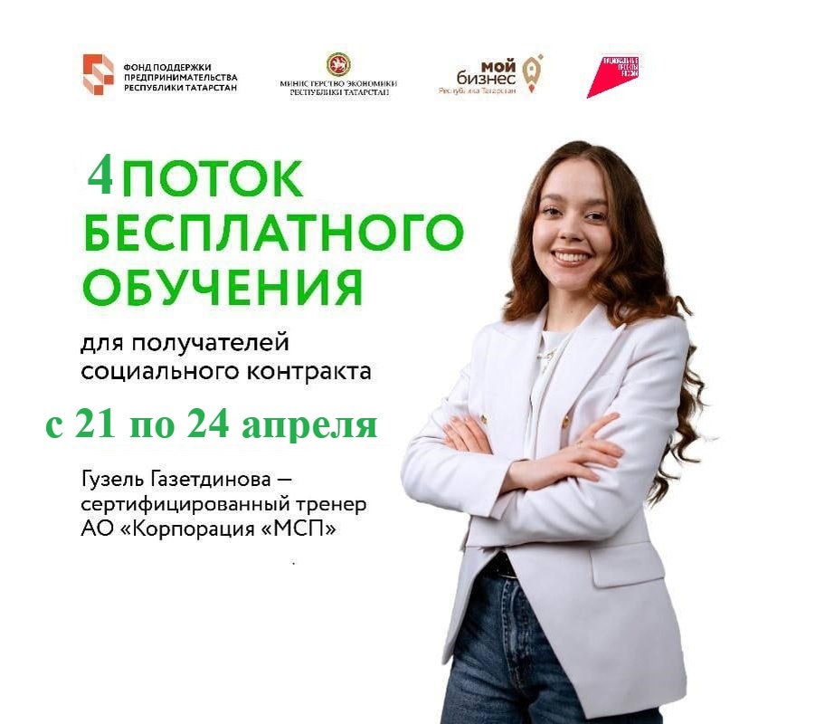 с 21 по 24 апреля, обучение в онлайн-формате Спикер: Гузель Газетдинова - сертифицированный тренер Регистрация по ссылке. Онлайн обучение направлено на изучение основ предпринимательства, а также составление бизнес-плана для заключения социального контракта. Реализация мер поддержки малого и среднего предпринимательства продолжается по национальному проекту «Эффективная и конкурентная экономика» Узнать подробнее о мерах поддержки Центра «Мой бизнес» Республики Татарстан можно по номеру: 8(843)524-90-90 Следите за самым важным в Telegram-канале Мой бизнес | Республика Татарстан
