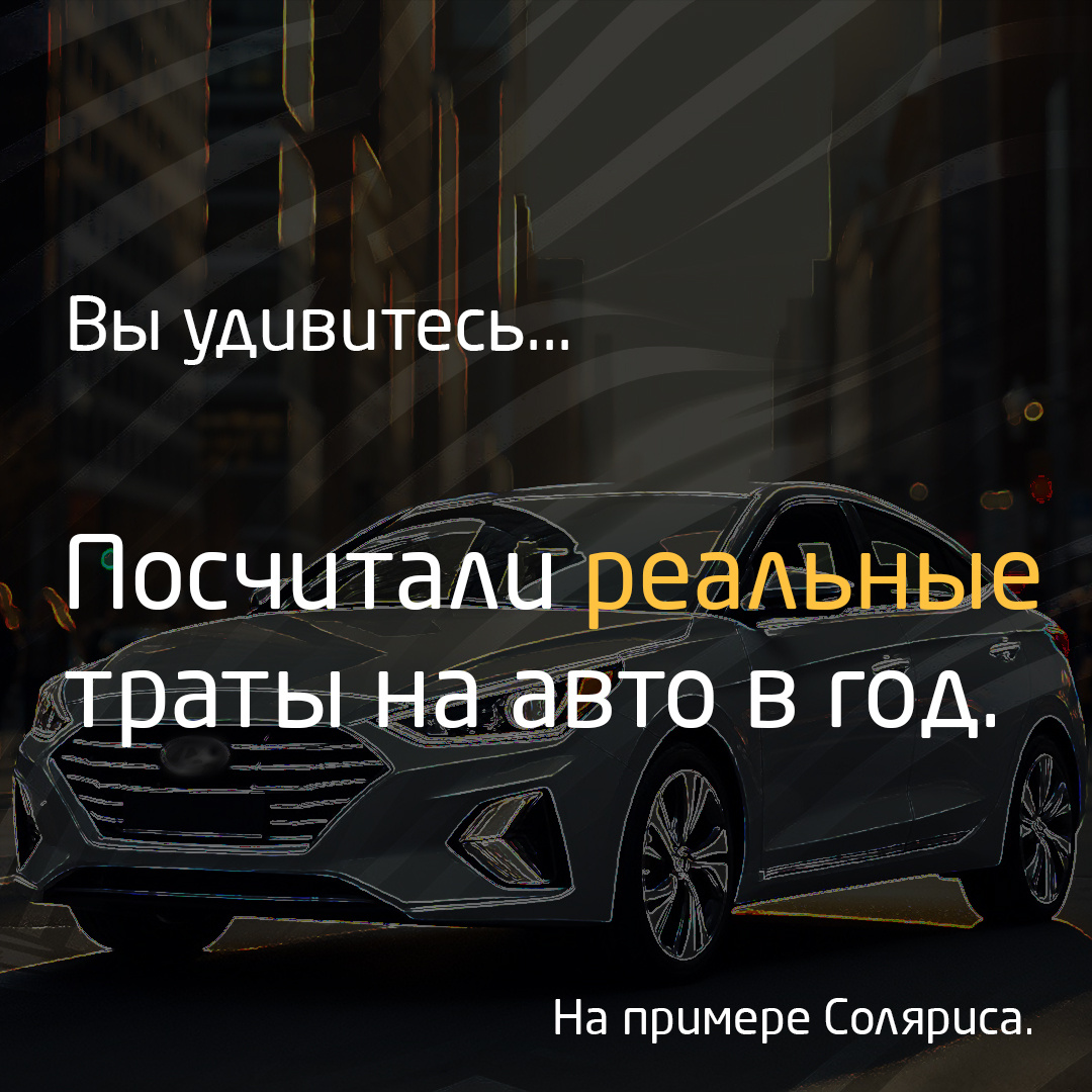 Траты на автомобиль обманчивы, заправили полный бак и успокаиваемся. В некоторых случаях это может быть даже не основная затратная часть. Давайте разберемся, какие траты существуют и примерные суммы за год эксплуатации. Для примера берем Hyundai Solaris 2017 года выпуска, который проезжает в среднем 15 000 км в год, можно выделить несколько основных категорий расходов: ### 1. Топливо - Расход топлива: Hyundai Solaris 2017 года имеет средний расход топлива около 7-10 литров на 100 км в смешанном цикле. - Стоимость топлива: при средней цене бензина 60 рублей за литр, затраты на топливо составят около 63 000 - 90 000 рублей в год. ### 2. Техническое обслуживание - Регулярное ТО: включает замену масла, фильтров и проверку основных систем. Стоимость одного ТО составляет около 5 000 - 8 000 рублей. При двух ТО в год это составит 10 000 - 16 000 рублей. - Замена расходных материалов: если взять тормозные колодки, ремни, свечи зажигания и другие компоненты. В среднем это еще плюс 10 000 - 15