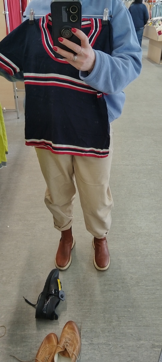 Опять на связи с Вами я, Анка-сэкондоманка. А покажу я Вам сегодня, то что не вошло в предыдущие обзоры. Правда материала немного, так что повествование будет коротким. И так, поехали! 1. Немного футболочек. Эта из плотного трикотажа. Предлагала приятельнице, но осталась в магазине. Эти вещи были в отделе всё по 300₽. 2. Футболочка канареечного цвета. Вискоза. Вот смотрю на неё сейчас, и думаю: " почему не взяла? "🤔300₽. 4. Этот топ- пчёлку предлагала дочери. Отказалась. По мне, так вполне симпатичная и весёлая. 5. И ещё предлагала вот такую красивейшую юбку на лето. Думаю, что эта юбка притягивала бы взоры. Но получила опять отказ. Наверное, я ничего не понимаю в молодежной моде. С удовольствием забрала бы себе, но она была слишком маленького размера. Её стоимость была 600₽. 6.А купила я себе вот это платье из плотной вискозы. Расцветка поближе. Здесь оно уже отпарено и аксессуары в процессе примерки. Сначала я прикинула этот ремень, из металлических колец. Подобрала его в стиль ри