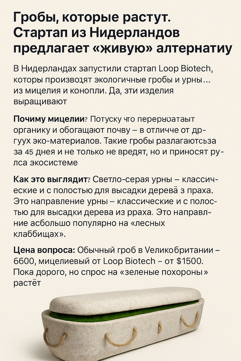 В мире всё чаще говорят об экологичных альтернативах традиционным похоронам. Один из самых ярких примеров — стартап Loop Biotech из Нидерландов. Он предлагает необычные, но очень логичные решения: гробы и урны из мицелия и волокон конопли. Как это работает? Мицелий — это подземная часть грибов. Он обладает удивительным свойством: перерабатывает органику и обогащает почву. Идея заключалась в том, чтобы использовать этот природный механизм в похоронных практиках. В результате — изделие, которое не просто разлагается, а становится частью природы, возвращая телу усопшего роль в круговороте жизни. В производстве используются: Гробы не собираются вручную — их выращивают в формах, и на это уходит всего 7 дней. Весит такой гроб около 30 кг, выдерживает до 200 кг и оснащён джутовыми ручками. Материал — влагостойкий, так что даже дождь не станет помехой для церемонии. Что с урнами? Loop Biotech выпускает и биоурны, которые можно: Идея саженца из праха — не новая, но мицелиевая урна