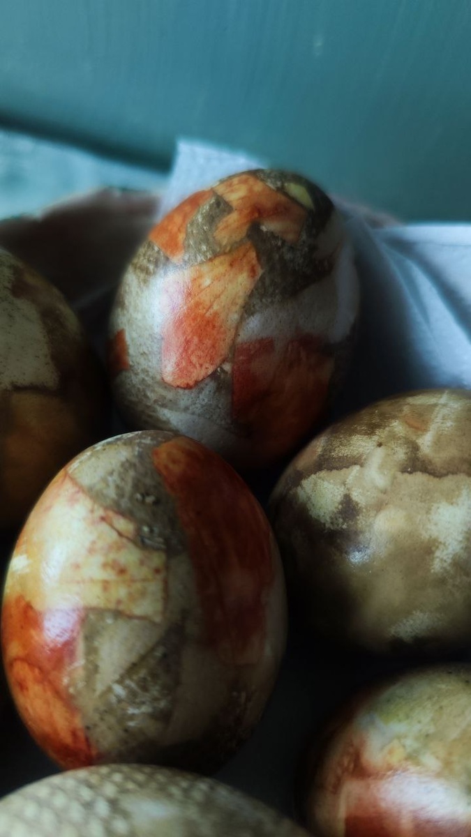 Если кому интересно, как такие получить. Каждое яичко в водичку смочили. Обваляли в предварительно нарезанной крупно (у меня) луковой шелухе и бумаге (помельче, она будет, как резервирующая в окрашивании). Все это завязываем в кусочек марли максимально туго. Чем плотнее шелуха прилегает к скорлупе, тем чётче отпечаток, некоторые даже с прожилками. Я ещё добавила маленькие кусочки краснокачанной капусты. Она сыграла минимально, или как светлые холодные участки, кое-где капелька холодного подтона. Все это богачество погружаем в кастрюлю с водой. В воде: соль, куркума, каркаде (у меня был в пакетиках, но можно крупную фракцию чая прямо на дне выложить, тогда она тоже даст отпечатки на яйцах), остатки луковой шелухи и ещё краснокачанной капусты ( но этот ингредиент вообще не существенен). Все это варим, как будто просто яйца и оставляем на ночь. С утра - магия разворачивания каждого яйца.