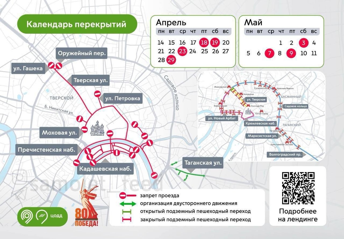 График перекрытия центра Москвы в связи с репетицией парада 9 мая.