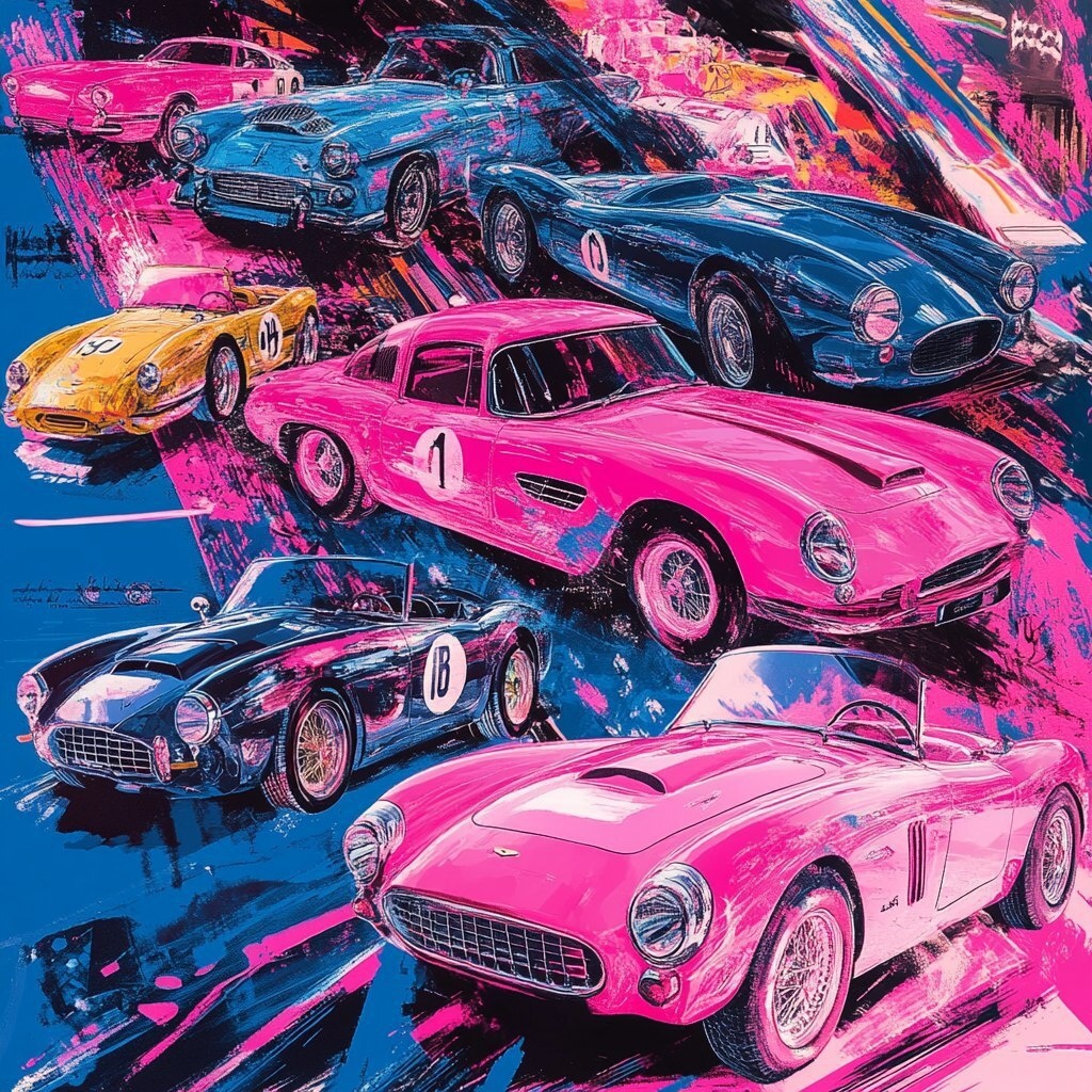 Создано на основе запроса: a collage of cars oldtimers and race cars in vivid colors pink and blue
