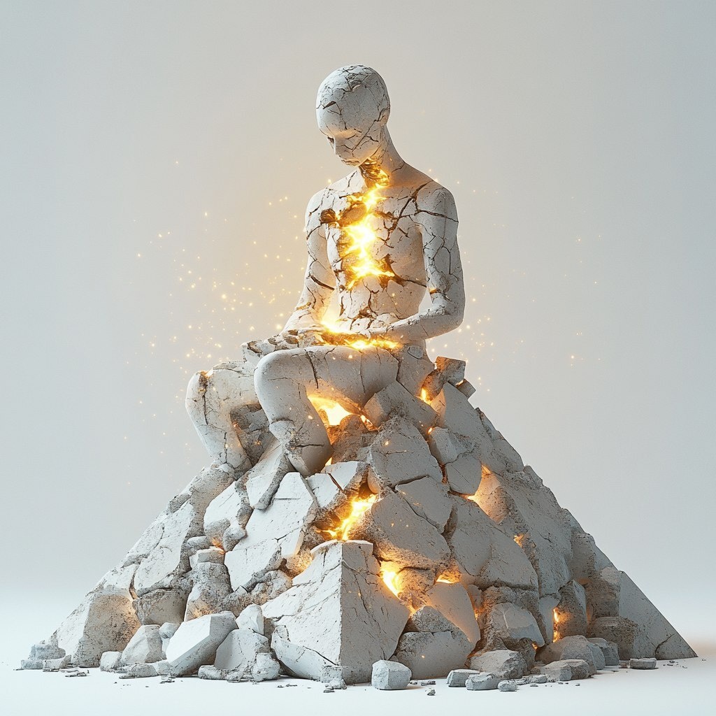 Создано на основе запроса: Fine art illustration. Surreal, minimalist. Abstract. Pure white background. A dubious human figure made of broken stone sits on an Egyptian pyramid of broken stones. It is breaking apart, its broken stones rising into infinity. It is levitating. From within, a human figure emerges, emitting intense golden light from its interior to the exterior. The scene is in light gray, off-white, and golden lights. Golden light emanates from the pyramid, and you travel through its broken stones. --- Автоперевод: Иллюстрация изобразительного искусства. Необычно получилось? 🤔 https://dzen.ru/id/65c0c65c86e4f837c27b24d7 #ИИ #AI #нейросеть #midjourney #art