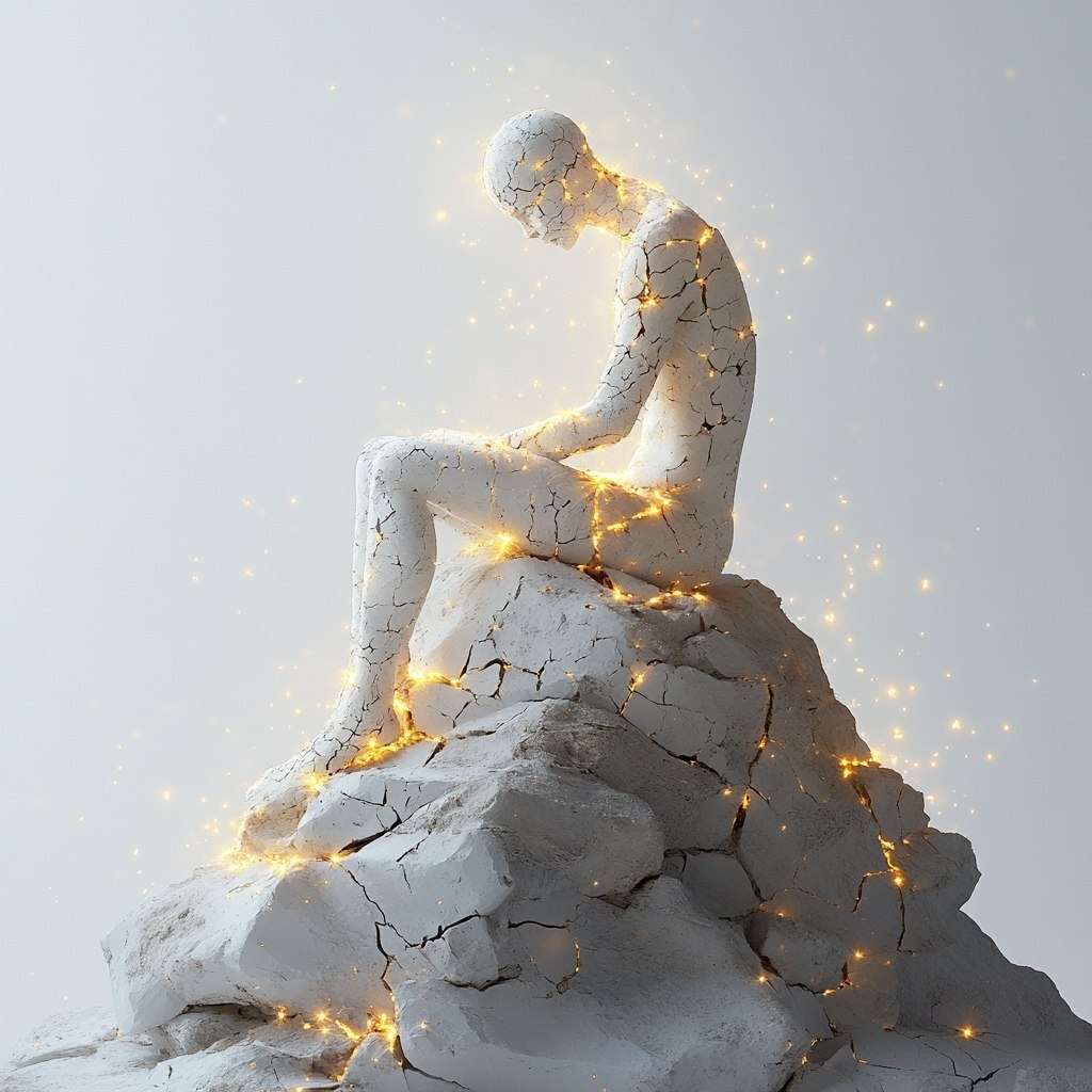 Создано на основе запроса: Fine art illustration. Surreal, minimalist. Abstract. Pure white background. A sad human figure made of broken stone sits on a pyramidal rock made of small stones that extends horizontally to infinity. It is levitating. The broken stones and the human figure emit intense golden light from within. The scene is in light gray, off-white, and golden lights. Golden light emanates from the pyramid and travels through its broken stones. --- Автоперевод: Иллюстрация изобразительного искусства. Отлично выглядит? 🤔 https://dzen.ru/id/65c0c65c86e4f837c27b24d7 #ИИ #AI #нейросеть #midjourney #art