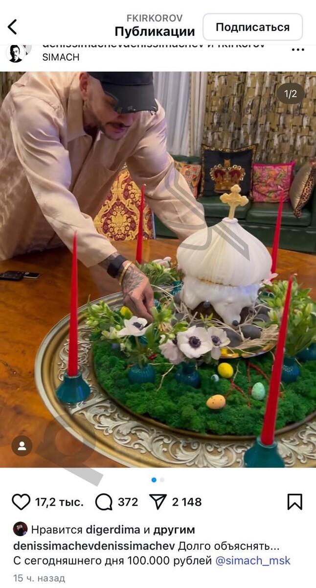 Тут стоит оговориться, что дизайнерский кулич в белой шапкой в виде церковного купола ( шапка из съедобной бумаги снимается и под ней традиционная глазурь с ягодами) и начинкой из дубайского шоколада Симачев лично привез домой к Киркорову.
