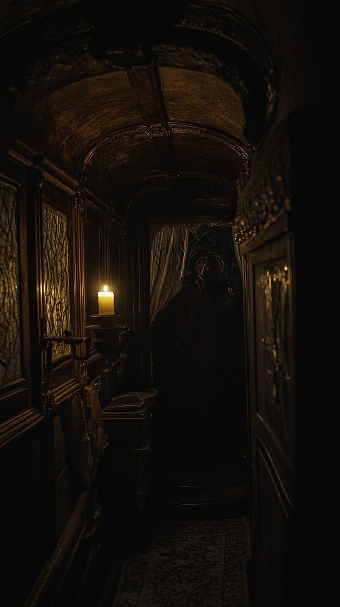 Создано на основе запроса: Inside the dimly-lit carriage, the candle suddenly goes out, leaving complete darkness, the vizier realizes