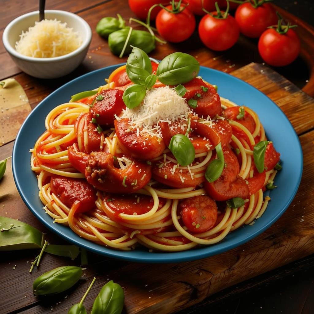 ✅ Подача и украшение 1. Варим спагетти 2. Готовим сосиски 3. Делаем томатный соус 4. Собираем блюдо 🔹 Используйте качественные томаты – лучше взять итальянскую пассату или домашний томатный соус.