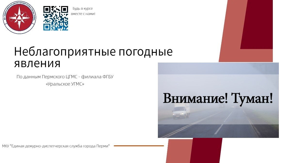 ⚠️По данным Пермского ЦГМС - филиала ФГБУ «Уральское УГМС» 19 апреля ночью и утром на территории Пермского края ожидается туман. Главное управление МЧС России по Пермскому краю рекомендует: 1. Водителям - соблюдать скоростной режим, избегать резких маневров и торможений, соблюдать дистанцию. Движение осуществлять с учетом дорожного покрытия и видимости. 2. Пешеходам – соблюдать осторожность при передвижении пешком, переходе проезжей части. ‼️Будьте внимательными и осторожными. О прогнозируемых погодных явлениях, соблюдении правил безопасного поведения и требований пожарной безопасности сообщите родным и знакомым. ☎️Телефон вызова служб экстренного реагирования: «01» - со стационарного телефона, «101», «112» - с мобильного телефона, вызов бесплатный.