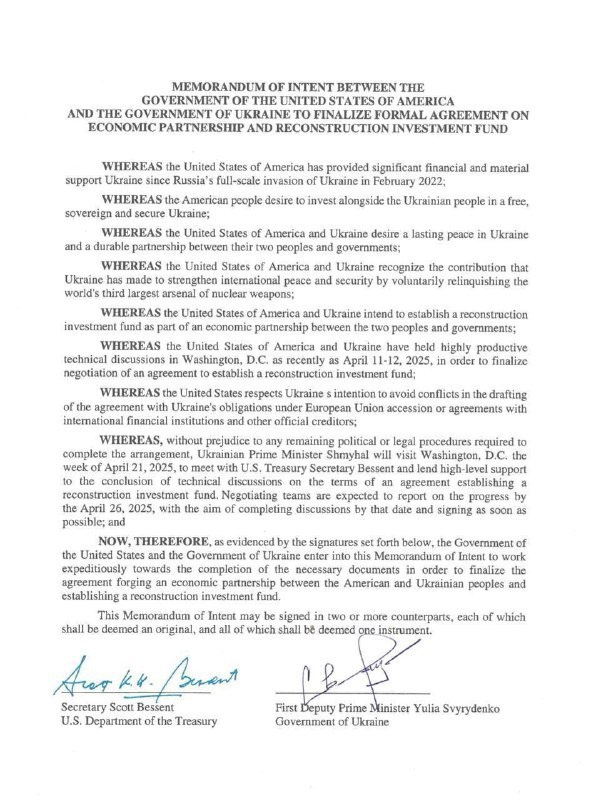 В тексте меморандума о сделке между Украиной и Соединенными Штатами Америки обсуждается экономическое сотрудничество двух стран и создание инвестиционного фонда для восстановления Украины после событий последних месяцев. Согласно опубликованному документу, правительство Украины признает значительный вклад США в поддержку страны с начала конфликта в феврале 2022 года. Обе стороны выражают стремление к достижению прочного мира и готовы совместно инвестировать в различные проекты на территории Украины. Следующий этап - это переговоры премьер-министра Украины Дениса Шмыгаля с министром финансов США Скоттом Боссеном, которые запланированы на следующую неделю. Во время этих встреч будет обсуждаться конкретная сделка, связанная с добычей и использованием редкоземельных металлов. Кроме того, в документе указано, что до 26 апреля переговорные группы должны предоставить подробный отчет о результатах своей работы, чтобы ускорить процесс заключения соглашения.