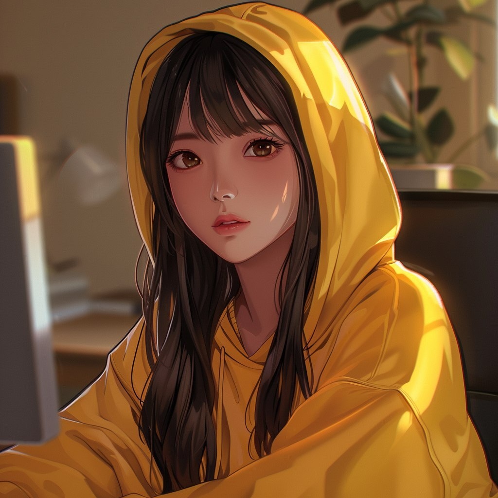 Создано на основе запроса: a cute 20-year-old Korean anime girl with straight dark hair and bangs, wearing a bright yellow hoodie with the hood up, big amber eyes, slightly blushed cheeks, calm expression, sitting in front of a computer, soft lighting, detailed anime style, consistent character --- Автоперевод: Симпатичная 20-летняя корейская аниме-девушка с прямыми темными волосами и челкой, одетая в ярко-желтую толстовку с капюшоном, большие янтарные глаза, слегка покрасневшие щеки, спокойное выражение, сидя перед компьютером, мягкое освещение, детальный стиль аниме, последовательный характер Хорошо получилось? 🤔 https://dzen.ru/id/65c0c65c86e4f837c27b24d7 #ИИ #AI #нейросеть #midjourney #art