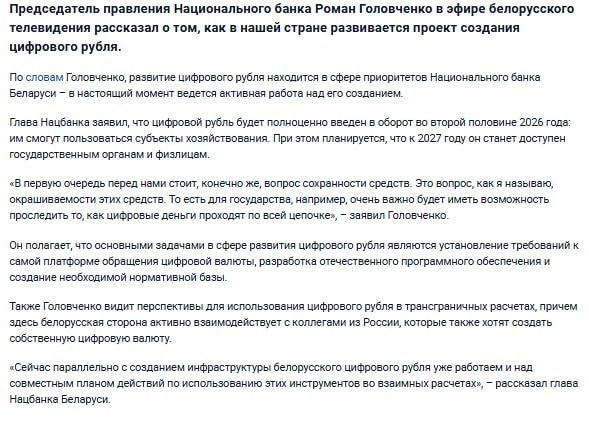 🔠🔠🔠🔠 В Беларуси цифровой рубль запустят во второй половине 2026 года: им смогут пользоваться субъекты хозяйствования. ☝🏻 При этом планируется, что к 2027 году он станет доступен государственным органам и физлицам.