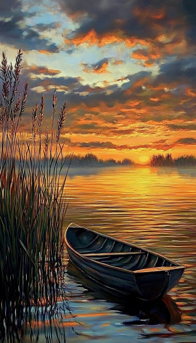 Автоперевод: , импрессионистская масляная живопись с гребной лодкой на воде, окруженная тростниками и высокой травой, с апельсиновым закатом на заднем плане.