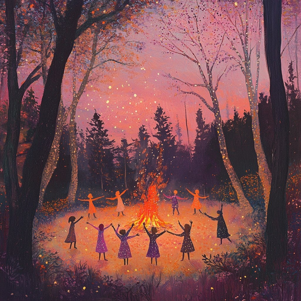 Создано на основе запроса: In the forest, a group of people dance in a circle around a bonfire, a magical atmosphere; Japanese style/print