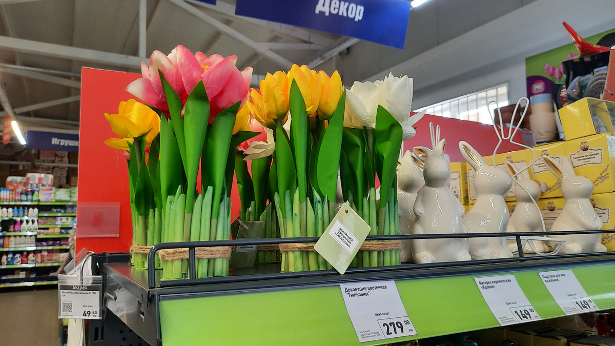 Декорация цветочная Тюльпаны цена 279 руб. В составе полипропилен, полиэстер, ПВХ, сталь, пенопласт и пенька. Страна Китай. На выбор три цвета.