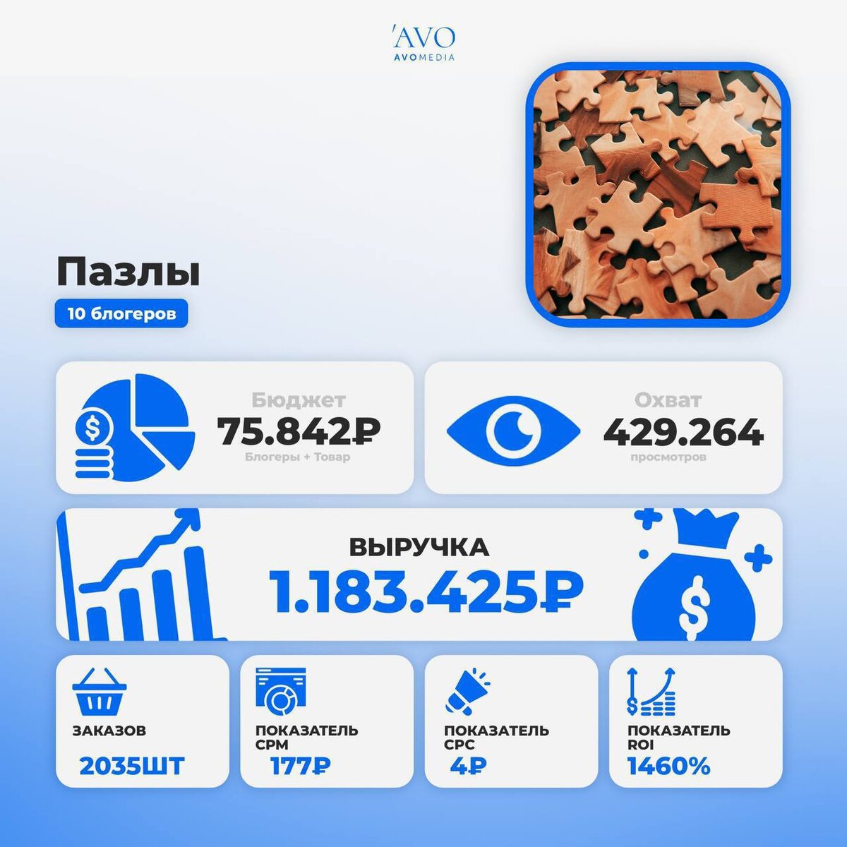 🧩 2035 заказов на деревянные пазлы с бюджета в 75.842₽ — и это не магия, а системная работа с блогерами В декабре к нам пришёл бренд с необычным продуктом — фигурные деревянные пазлы. Мы сделали упор на эстетику, подарок, эмоции ребёнка. Товар крутой, но органика такое как правило не тянет, ВБ не даёт трафика, а в категории детских товаров можно утонуть в попытке найти действительно крутой подарок ребенку. 👉 Поэтому мы сразу поняли, нужен запуск с результатом — не “посмотрели”, а “купили”. #кейс Что сделали: 🔹 Подобрали 10 блогеров — все нацеленные на ЦА с детьми 🔹 Проверили всё: вовлечённость, гео, историю размещений 🔹 Сразу просчитали точку окупаемости по каждому — сколько заказов должен дать, чтобы выйти в плюс 🔹 В ТЗ вписали: показать эмоции ребёнка, момент сборки, идею подарка _____ Что получили: 📊 Охват — 429.264 📊 Бюджет (реклама + товар) — 75.842₽ 📦 Заказов — 2035 💰 Выручка — 1.183.425₽ ⚙️ СРМ — 177₽ ⚙️ СРС — 4₽ 📈 ROI — 1460% Один заказ обошёлся в среднем в 3