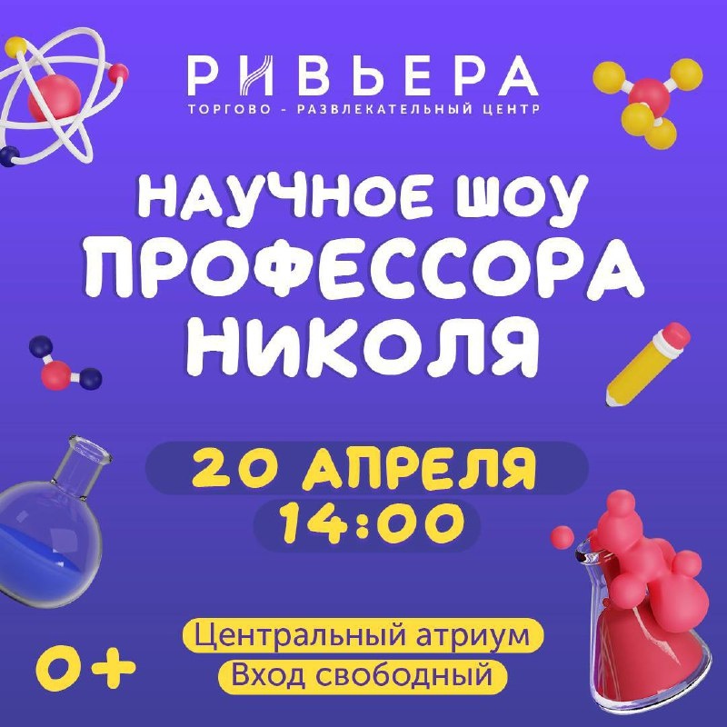 🆓 «Научное шоу профессора Николя в Ривьере @rivieramoscow 📍ТРЦ «Ривьера», центральный атриум 🗓️20 апреля с 14:00 ➡️ В ПРОГРАММЕ: 🔵 большая оптическая иллюзия; 🔵 эксперименты с сухим льдом 🔵 взрыв шарика с водородом; 🔵 превращение воды в гель; 🔵 огненная пена; 🔵 исчезающие чернила; 🔵 большая центрифуга со стаканами; 🔵 мощная воздуходувка; 🔵 электростатическая левитация и много других увлекательных экспериментов! 🆓Бесплатно Подробнее ЗДЕСЬ 👨👩👧👦 @Together_with_kids Пост носит информационный характер