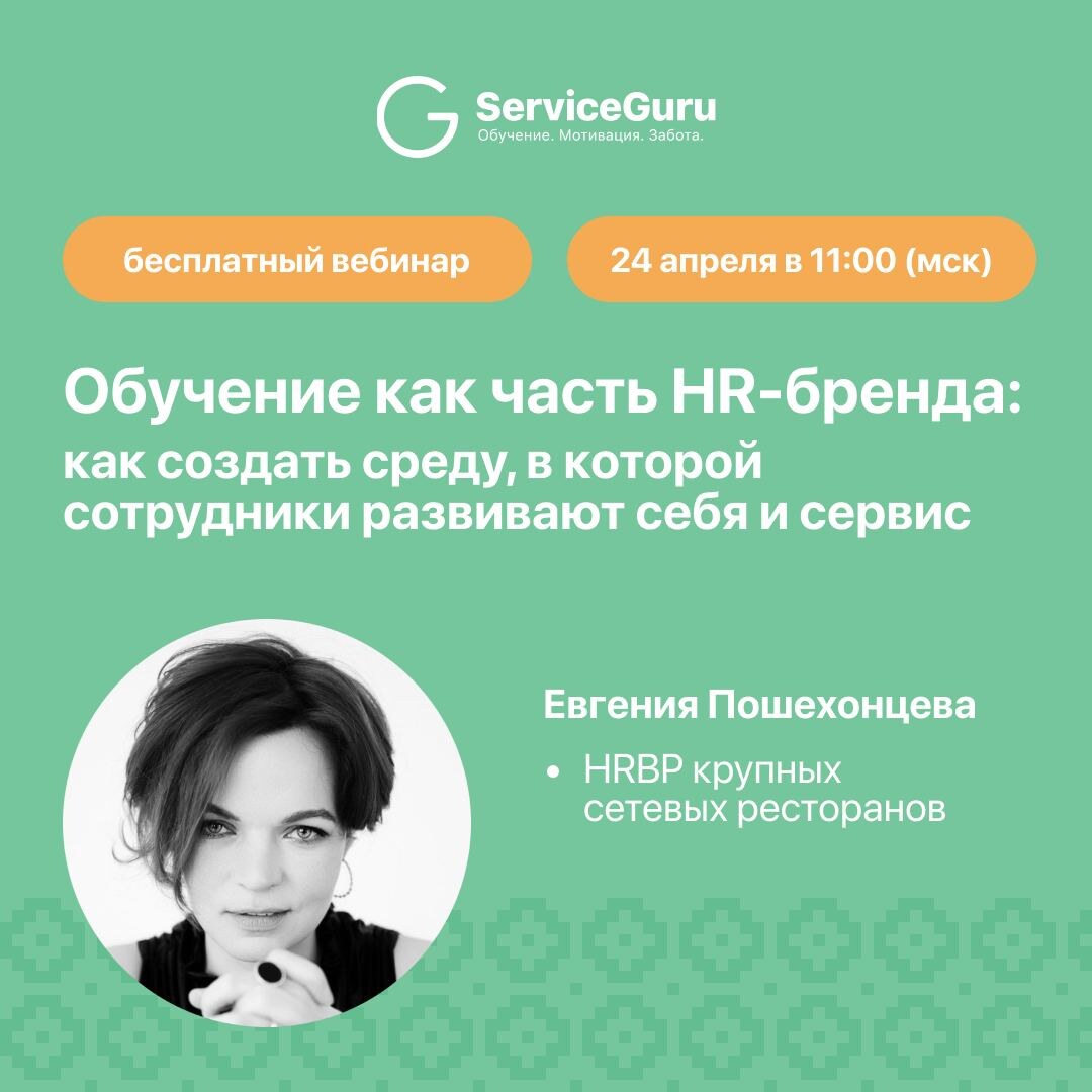 📊 94% сотрудников остаются в компании, если есть развитие (LinkedIn) 📊 60% зумеров считают наличие обучения решающим фактором (HeadHunter) Как проводить обучение, чтобы оно не ограничивалось скучными формальностями ✖️, а стало частью сильного HR-бренда, точкой притяжения талантливых сотрудников и фактором, снижающим текучку? Обсудим на бесплатном вебинаре 🔔"Обучение как часть HR-бренда — как создать среду, в которой сотрудники развивают себя и сервис?" 📆 24 апреля в 11:00 (мск) 🎙Спикер — Евгения Пошехонцева, эксперт по сервису, HR и обучению сотрудников, HRBP крупных сетевых ресторанов. Запустила сервис и команду в 40+ проектах по всей России, 5 лет работала за границей. В прямом эфире обсудим: ✔️Мотивация к обучению: как пробудить интерес и включённость? ✔️Аттестация по меню за 4 дня — не миф, а реальность! ✔️4 элемента среды, в которой хочется учиться: от атмосферы до действий руководителя ✔️Как создавать вовлекающие и крутые учебные материалы без методолога? ✔️Аттестация ка