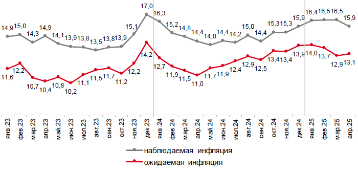 Эти данные особенно важны, учитывая, что 25 апреля Банк России проведет опорное заседание по денежно-кредитной политике. По его итогам будет принято решение по ключевой ставке, представлен среднесрочный макроэкономический прогноз, а глава регулятора Эльвира Набиуллина проведет пресс-конференцию. Источник: «инФОМ», Банк России В апреле инфляционные ожидания россиян выросли до 13,1% с 12,9% месяцем ранее, когда они достигали самого низкого значения с сентября. Таковы результаты опроса «инФОМ», проведенного по заказу Банка России 2—11 апреля 2025 г. среди 2000+ респондентов в 100 населенных пунктах в 54 субъектах РФ. В группах респондентов, которые имеют и не имеют сбережений, отмечена разнонаправленная динамика ожидаемой инфляции. В первой категории отмечен ее рост, а во второй продолжилось снижение. Источник: «инФОМ», Банк России Что касается наблюдаемой инфляции, то здесь наблюдается аналогичная ситуация. Источник: «инФОМ», Банк России Доля участников опроса, которые не имеют финансово