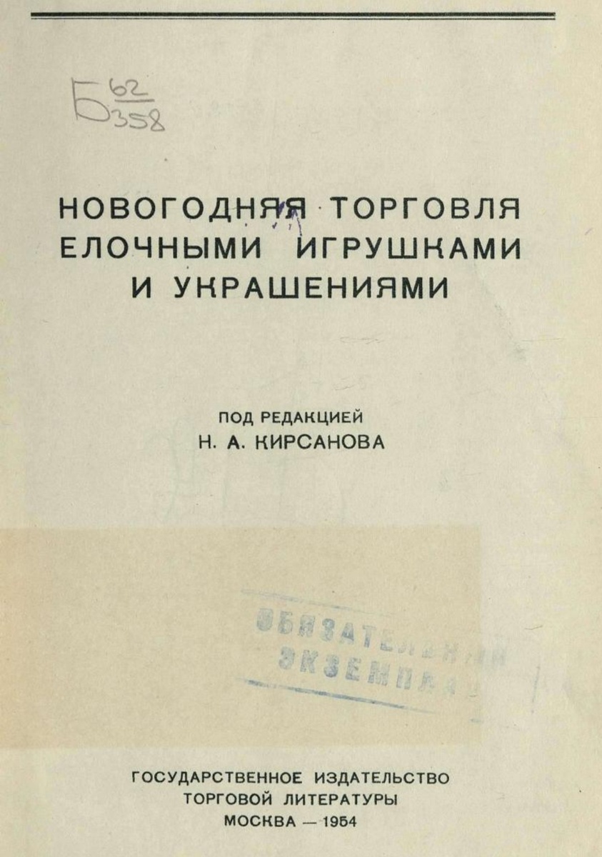 Сегодня я хочу представить вашему вниманию книгу, выпущенную в 1954 году. Это «Новогодняя торговля елочными игрушками и украшениями», которая была создана под редакцией специалиста в области торговли — Н.А. Кирсанова.