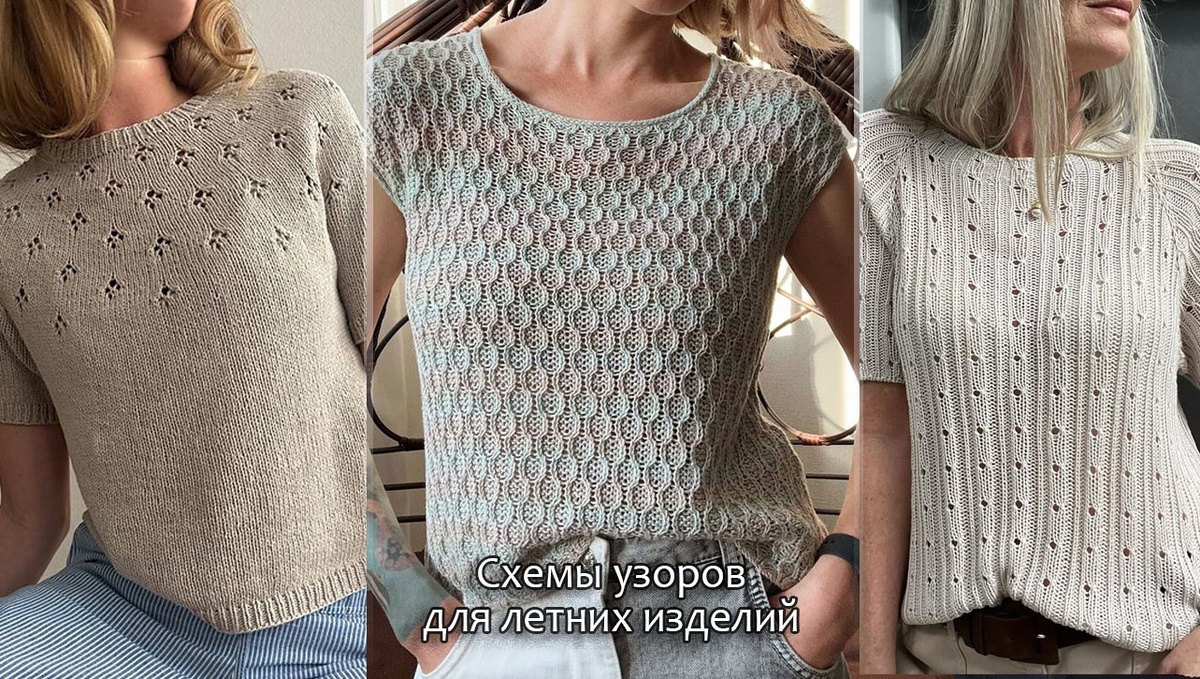 Совсем недавно публиковала статью с подборкой простых ажурных узоров для топов, однако после публикации я нашла еще несколько любопытных моделей с узорами, которые идеально подойдут для летних изделий. В этой статье поделюсь новыми схемами с вами. Не забудьте подписаться на канал и поставить лайк этой статье. На моем канале вы найдете мастер-классы, полезные статьи со схемами узоров и видео с обзором пряжи, инструментов и вязаных изделий. Люблю, кога ажуром наполнено не все полотно изделия, а только часть его. Это позволяет не надевать первый слой под ажурный топ и вязать такие изделия намного быстрее. В примере ниже ажуром выполнены "галочки" или "птички" в верхней части топа. Схема узора Здесь и далее: Схемы подходят для кругового вязания и вязания поворотными рядами. При вязании поворотными рядами лицевые ряды вязать по условным обозначениям, изнаночные - по узору (если не указано другое). Если в схеме указаны накиды, в изнаночных рядах их провязывать изнаночной петлей. Раппорт узо