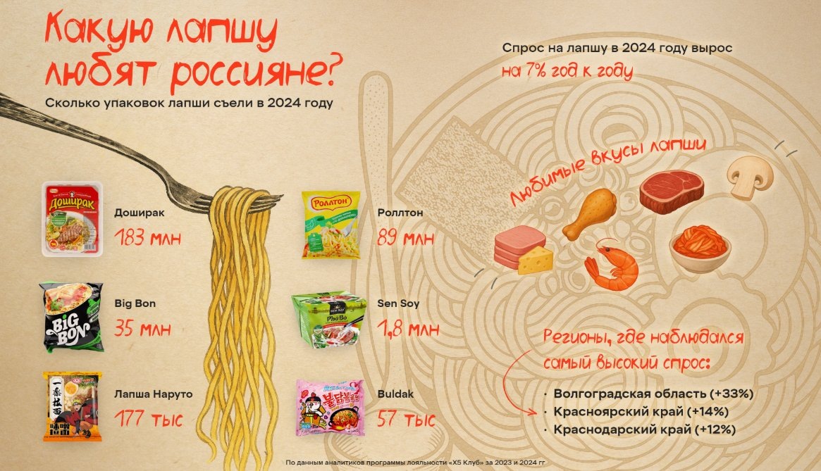 Эксперты программы лояльности «X5 Клуб» выяснили, какие вкусы лапши любят россияне и в каких регионах ее едят чаще всего. По данным продаж в торговых сетях X5 за 2023–2024 годы, спрос на лапшу и готовые супы стабильно растет.