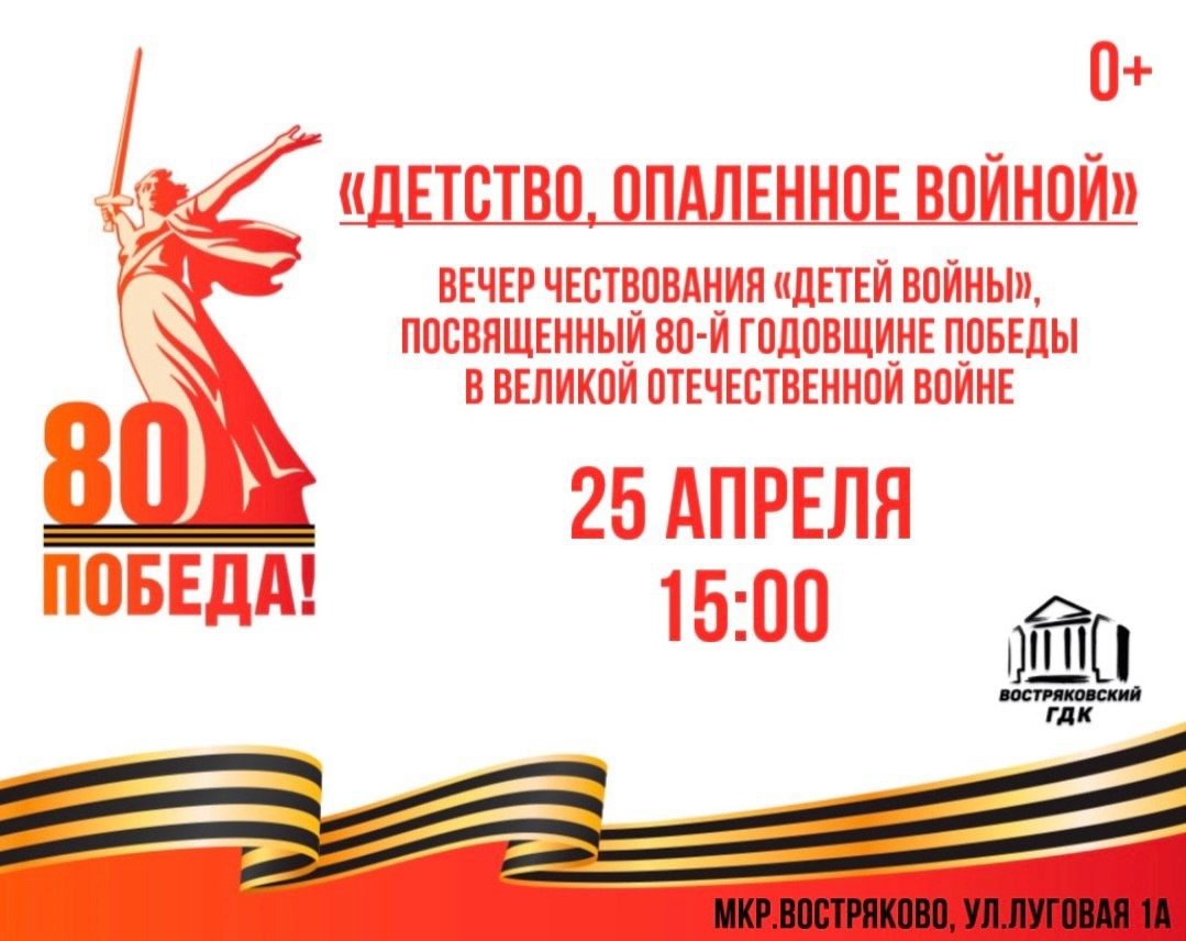 ✨ Приглашаем🧡 25 апреля в 15:00 в Востряковском ГДК состоится вечер чествования «детей войны», посвященный 80-й годовщине Победы в Великой Отечественной войне 🚫 Возраст: 0+ 📆 25.04.2025🕒15:00 🏢 Востряковский городской Дом культуры (ГДК) 📍 г.о.Домодедово, мкрн.Востряково, ул. Луговая,д.1а ✅ Мероприятия Домодедово https://dzen.ru/id/66f10385cc4c5a16f7b5fb02 http://vk.com/domodedovo_events http://dzen.ru/domodedovo_events