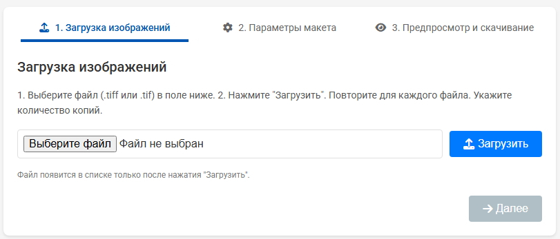 2. На этапе «Загрузка изображений» выберите TIFF-файлы (CMYK, до 20 МБ).