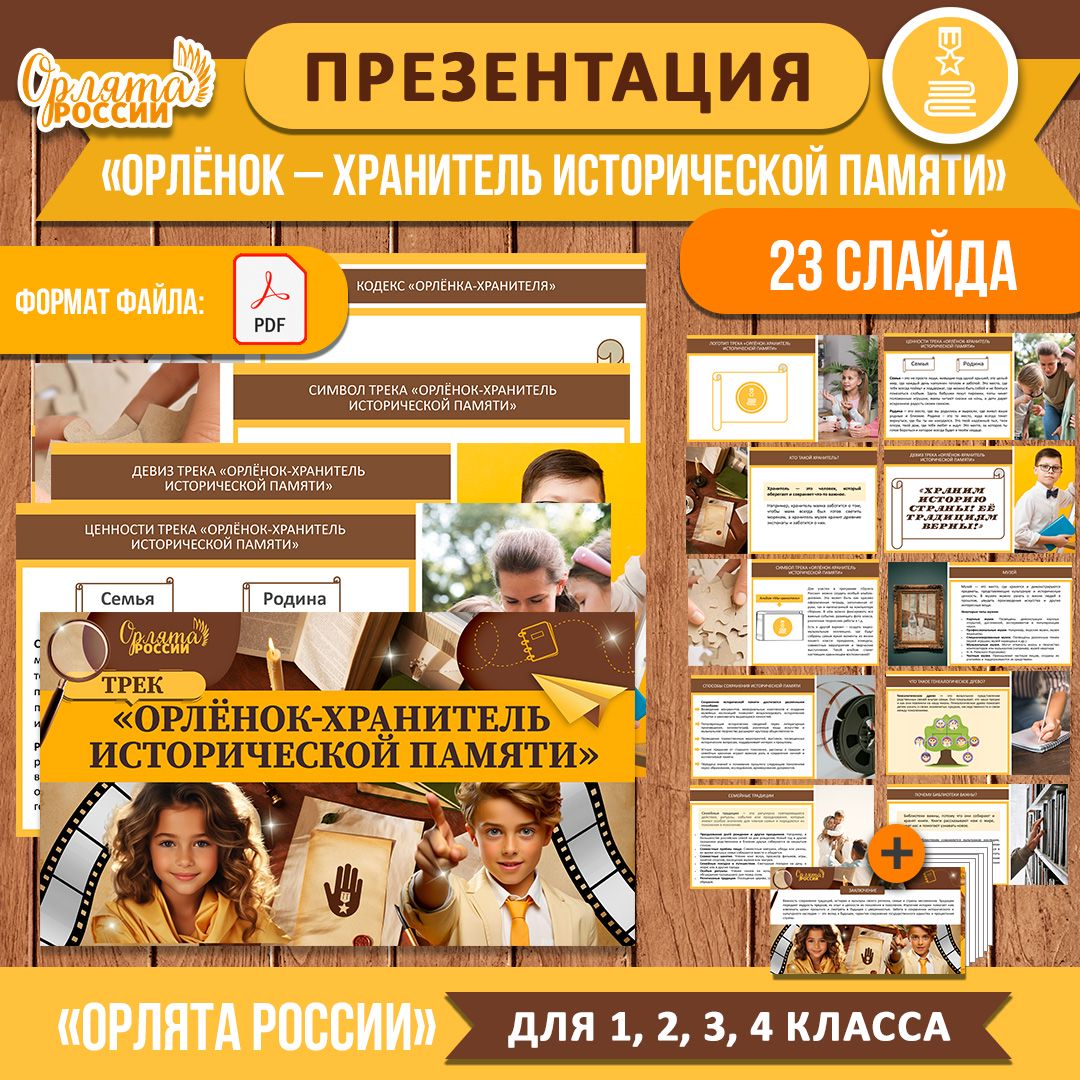Презентация «Орлёнок-Хранитель исторической памяти» создана специально для внеурочной деятельности «Орлята России» к треку «Орлёнок-Хранитель исторической памяти» для учеников 1, 2, 3, 4 классов.