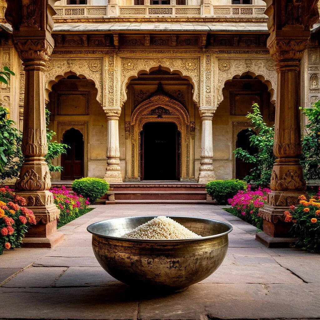 Но поскольку Кришна - это аватар божества, то есть он всеведущ, сам взял у него эту плошечку. Он положил в свой рот рисинку и стал наслаждаться ею, смаковать и сказал: "Это моё самое любимое блюдо. Это блюдо, которое доставляет мне наивысшее наслаждение. Это лучший дар!" И столько счастья и благодати изливалось из Кришны в окружающий мир в момент этого наслаждения, что в мире многое поменялось. Тогда жена Кришны забрала у него эту плошечку и не позволила ему съесть вторую рисинку, чтобы в мире не изменился окончательно баланс. Потому что в мире должен быть баланс, не может быть только чего-то одного больше, чем всего остального, то есть только добро, счастье и благость тоже быть не может, чтобы сохранялся этот баланс и равновесие.