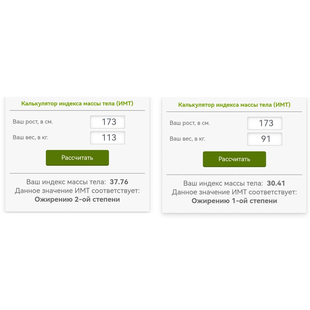 ИМТ. Перешла из 2-й в 1-ю степень ожирения. Минус 22 кг. Трансформация 113 кг ➡️ 63 кг.