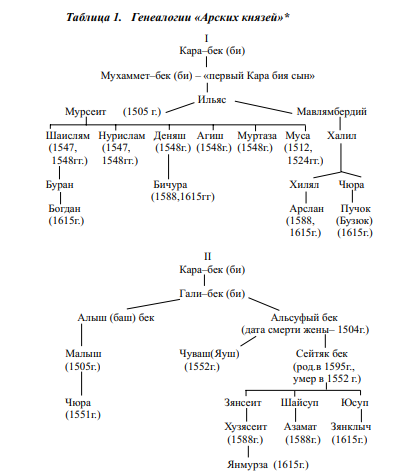 Это, во-первых, Шахмансур (живший, видимо, в конце XV – начале XVI в.), его сын Газы/Казы (умерший до 23 марта 1544 г.) и внуки Касым/Кайсым (упомянутый в актах от 6 мая 1542 г. и 2 февраля 1566 г.; не от него ли пошли Касимовы?) и его неназванный по имени «брат» (зафиксированный грамотой от 28 января 1551 г.); во-вторых, Али (живший, скорее всего, во второй половине XV – начале XVI в.), сын Алисуф (умерший до 23 марта 1544 г.), внук Сяйтяк/Сейтяк (известный грамоте от 6 мая 1542 г.), правнук Исуп (упомянутый актом от 23 марта 1544 г.); в-третьих, Ильяс (живший, вероятно, в конце XV – начале XVI), сын Мурсеит (умерший до 23 марта 1544 г.), внуки Муса (умерший до 20 июля 1548 г. после возвращения из 12-летнего казанского плена), Шеислам (уп. в актах от 6 мая 1542 г. и 20 июля 1548 г.), Аруслан/Нураслам (уп. в документах от 23 марта 1544 г. и 20 июля 1548 г.; не он ли стал основателем Арслановых?), Дюняша (уп. 20 июля 1548 г.; не от него ли Дюняшевы?), Агиша (уп. 20 июля 1548 г.) и Муртуза (уп. 20 июля 1548 г.); в-четвёртых Олеша (живший, очевидно, в конце XV – начале XVI в.), сын Малышка (умерший до 23 марта 1544 г.), внук Чюр/Чур (уп. 23 марта 1544 г.); в-пятых, Азегмет (уп. 24 января 1551 г.), сын Чукава (уп. 24 января 1551 г. и умерший до 2 февраля 1566 г.) и внуки Езикеш (умерший до 2 февраля 1566 г.) и Махмет (уп. 2 февраля 1566 г.) и, в-шестых, Карачур с неназванной по имени женой (уп. 20 июля 1548 г.), их сын Башканда (уп. 20 июля 1548 г. и марте 1553 г.) и неизвестные по именам внуки (уп. в марте 1553 г.). Не исключено, что поместья и угодья в бассейне реки Чепцы, которыми владели поименованные в изученных документах арские князья, получили их предки ещё в конце 1489 г. во время перехода на московскую службу.