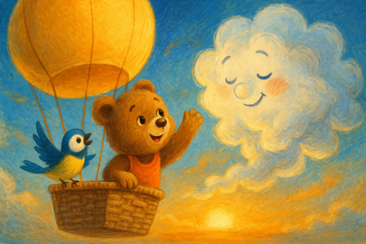 Через час на поляне у большого пруда стояла корзина. В ней — сидел медвежонок. Над ней — качалась огромная связка шаров из маминых запасов надувных шариков ко дню рождения и верёвок. Ляля крутилась рядом, проверяя узлы, как опытный капитан.