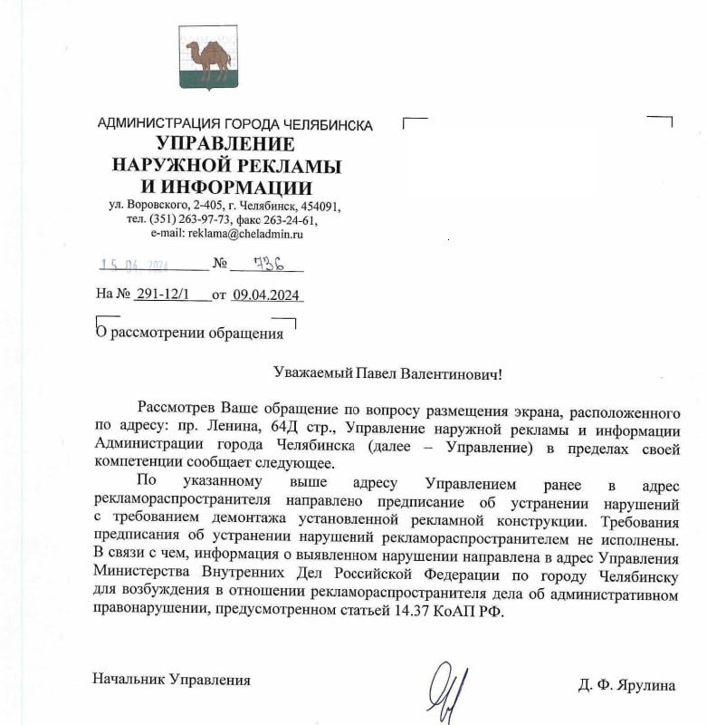Уже больше года прошло с ответа Управления Рекламы о том что незаконный баннер установлен с нарушением. В концепции данного объекта этого баннера вообще не был, но застройщик получается обманул и жителей города и установил с нарушением данный баннер. Ну ок, есть нарушение, данный факт зафиксирован, а дальше то что? В течении года администрация нашего города ничего не может сделать? А зачем нам тогда нужно это управление рекламы, если они не могут за год решить вопрос с нарушением прям в самом центре города? Или сейчас вопрос к МВД? Почему они активно не подключаются для решения?