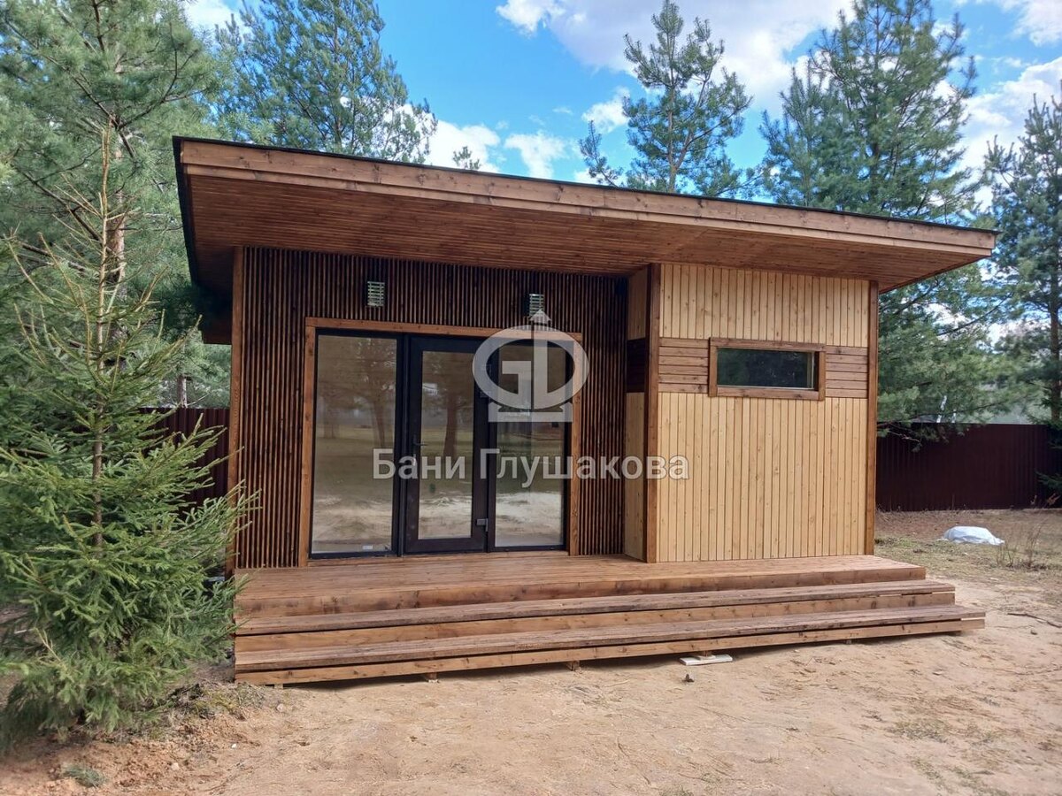 Принёс показать вам красоты. Баня «Суоми» 4х6. Отделка планкеном. Панорамные окна в окружении ёлочек и сосен – это фантастика.