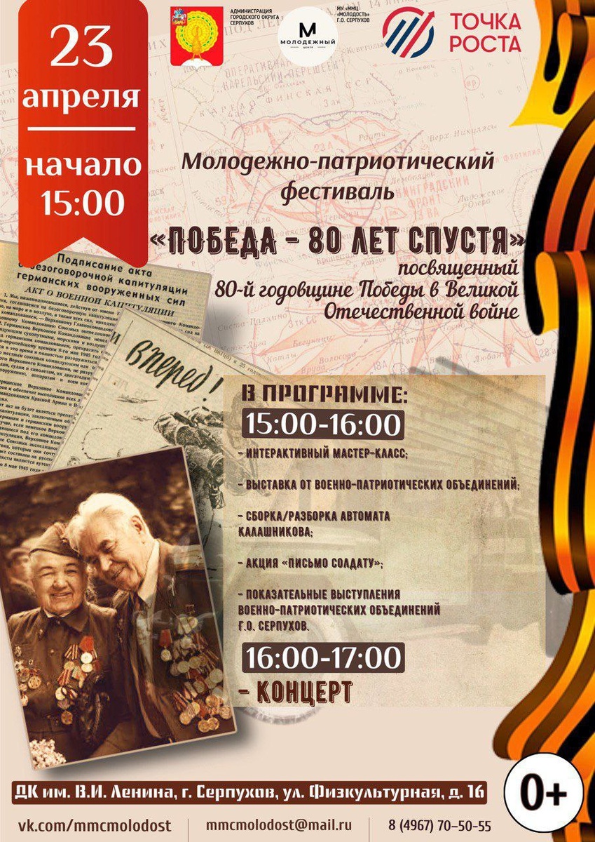 ✨ Молодежно-патриотический фестиваль - Патриотический концерт; - Выставка от военно-патриотических объединений; - Интерактивный мастер-класс; - Сборка/разборка автомата; - Акция «Письмо солдату» и многое другое. ⭐️Начало работы выставки в 15:00, начало концерта в 16:00. 🚫 Возраст: 6+ 📆 23.04.2025 🕒 15:00 🏢 ДК им. В.И. Ленина 📍 г. Серпухов, ул. Физкультурая, д.16 💰 Вход свободный❗️ #webСерпухов ✅ Мероприятия Серпухов https://dzen.ru/id/66f01c6eb4c6fe60c9ca1608 http://vk.com/serpukhov_events http://dzen.ru/serpukhov_events