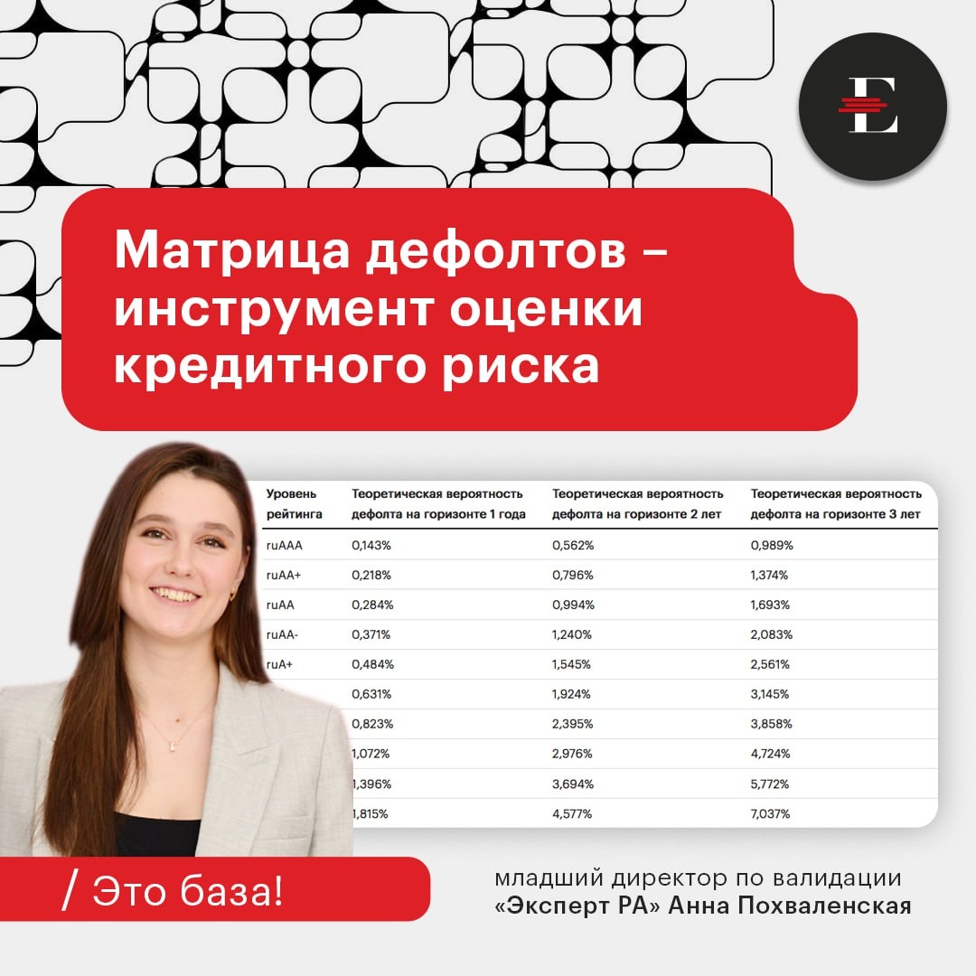 📌 Рейтинговое агентство «Эксперт РА» регулярно публикует матрицу дефолтов, которая пользуется высокой востребованностью среди профессиональных участников рынка, включая инвесторов и риск-менеджеров. Этот инструмент позволяет оценивать кредитные риски, присущие компаниям и финансовым инструментам. Он представляет собой результат многолетнего анализа и систематизации данных. 🔴Какие ключевые понятия нужно освоить, чтобы пользоваться матрицей дефолтов «Эксперт РА»? 🔴По каким принципам она строится? 🔴Какие мифы существуют относительно вероятности дефолта в той или иной рейтинговой категории и почему важно им не поддаваться? 🔴Как использовать матрицу на практике и почему важно отслеживать ее обновления? Обо всем рассказала умница, математик и просто красавица Анна Похваленская, младший директор по валидации «Эксперт РА», в своей новой статье «Матрица дефолтов как инструмент оценки кредитного риска». Опубликовали ее для вашего удобства на сайте агентства ⬇️ 📑 ЧИТАЕМ и просвещаемся!