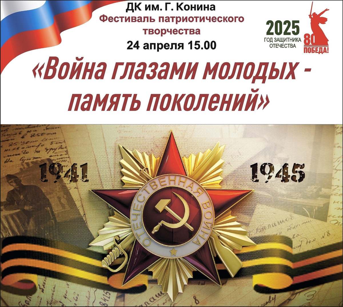 Дворец культуры имени Конина приглашает на фестиваль патриотического творчества «Война глазами молодых — память поколений»