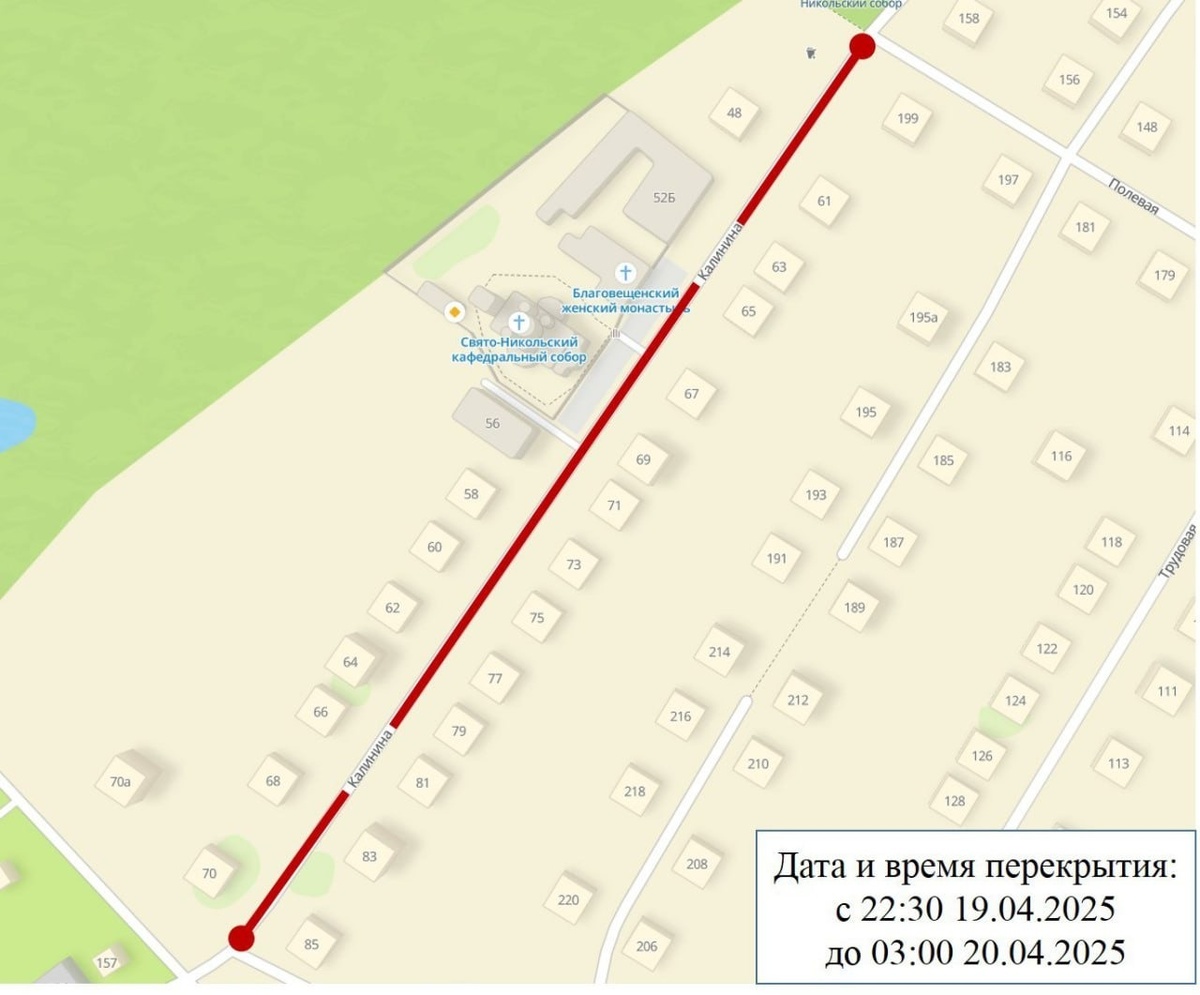 Две улицы временно перекроют на Пасху в Стерлитамаке. Речь идет об улицах Халтурина – от Худайбердина до Сакко и Ванцетти и Калинина – от Полевой до Степной. Ограничения будут действовать с 23 часов 19 апреля до 03.00 20 апреля.