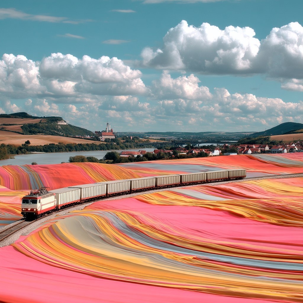 Создано на основе запроса: A train moving through the landscape of an abstract field made up entirely from colorful paper strips, in the