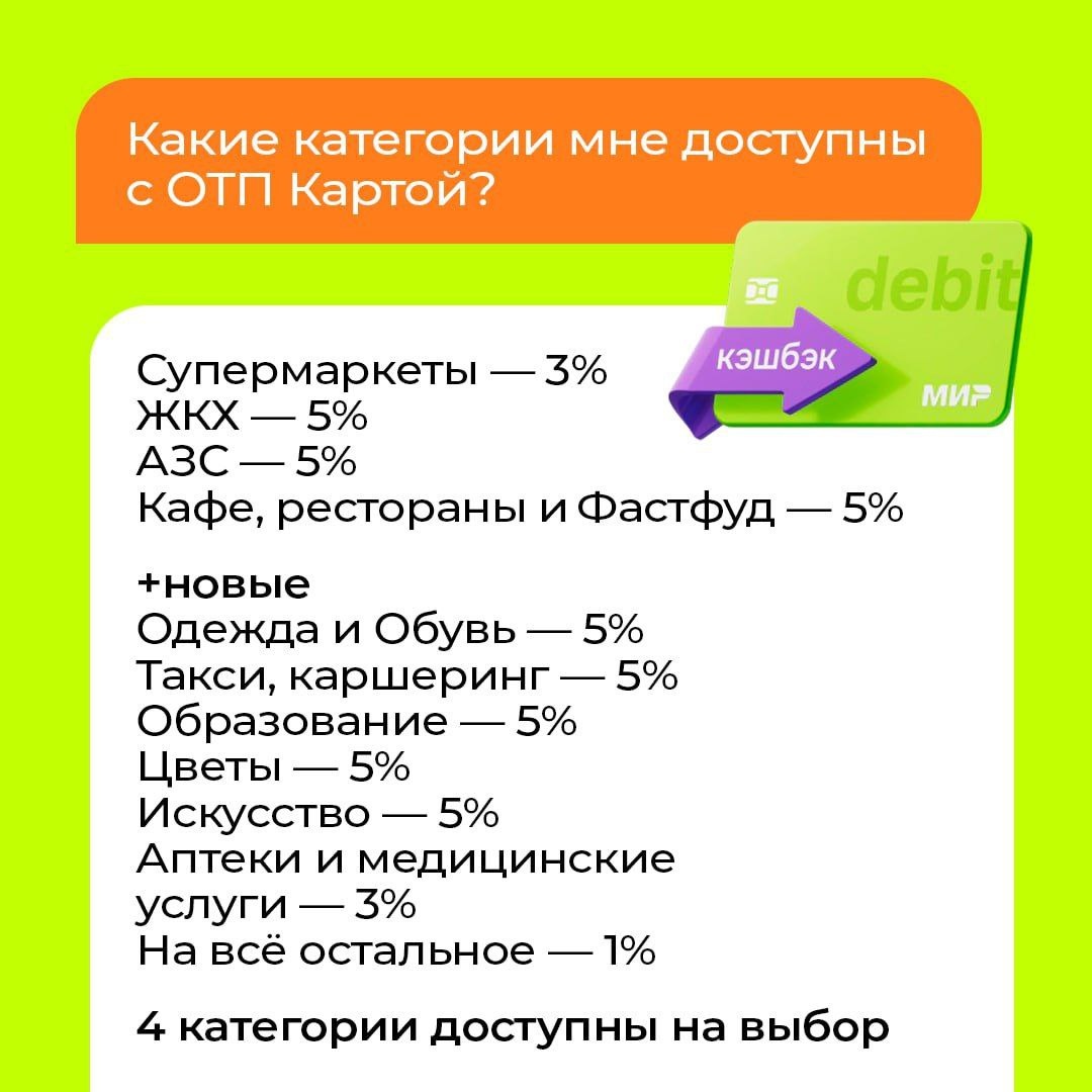 С 01.05.25 изменится бонусная программа по всем дебетовым картам ОТП: помимо фиксированных категорий (они остаются) к ним добавятся новые: ОТП Карта – 4 категории, до 3000₽ ОТП Premium Light – 6 категорий до 5000₽ ОТП Premium – 8 категорий, до 20 000₽ Плюс фиксированные категории: 5% за ЖКХ, АЗС, кафе и фастфуд и 3% на продукты Клиенты сами будут выбирать кэшбэк - 25 числа каждого месяца (до выбора кэшбэк начислять не будут) Документы с MCC категорий: по ОТП Карте / ОТП Premium / Premium Light За оформление бесплатной дебетовой ОТП карты по этой ссылке будет бонус 500₽ при тратах на 3000₽ в первый месяц. Также можно получить 1000₽ за кредитную карту 120 дней без % (можно выпустить виртуальную) С таким количеством категорий, ОТП заменит большинство других карт для покупок 🔥