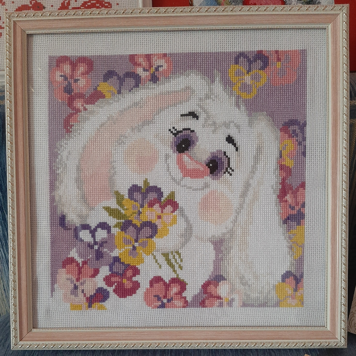 Финиш. Вышивка завершена и оформлена. Степашка-улыбашка , так зовут нового обитателя моего вышивально мира. Милый белый кролик с букетом цветов добродушно улыбается на ярком фоне россыпи цветов. Каждый крестик, словно пиксель в цифровом искусстве, складывался в эту трогательную картину на канве 11 каунта. Нить за нитью, оттенок за оттенком, вырисовывался пушистый силуэт, наполняя полотно позитивом и радостью. Белоснежная шерстка кролика контрастирует с буйством красок вокруг . В его лапках – пышный букет, словно символ нежности и весеннего пробуждения. Фон вышивки – это настоящая феерия красок. Здесь и нежные тона, и яркие насыщенные оттенки, создающие ощущение летнего луга, залитого солнцем. Кажется, что можно почувствовать аромат полевых цветов, едва взглянув на эту картину. Вышивка завершена и оформлена , а Степашка-улыбашка радует глаз и дарит хорошее настроение . Это не просто вышивка – это частичка души, вложенная в каждый крестик, в каждую нить.