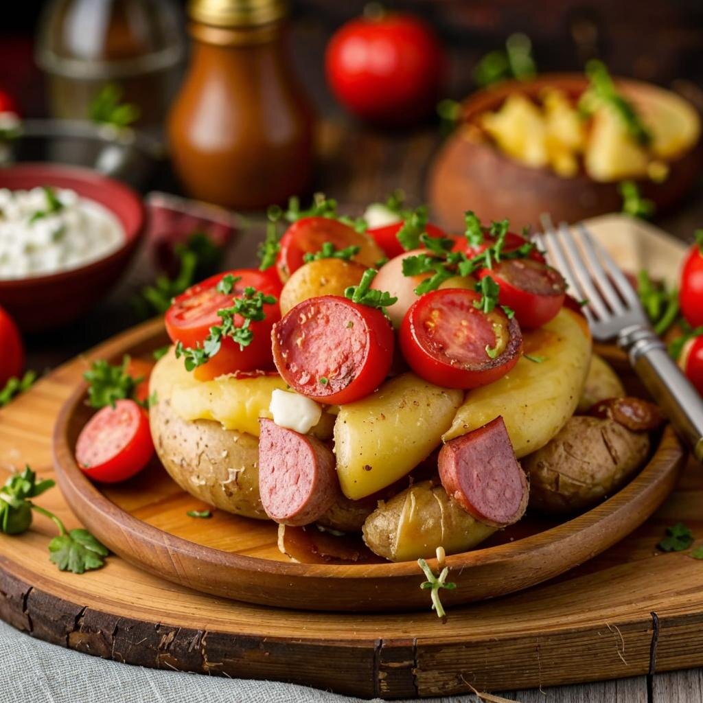 Вкусная, сытная и ароматная запечённая картошка с сосисками, помидорами и сыром — идеальное блюдо для семейного ужина или дружеских посиделок. Оно готовится быстро, требует минимум усилий, но при этом получается очень аппетитным. Хрустящая картошка, нежные сосиски, сочные помидоры и тягучий сыр — сочетание, от которого сложно отказаться! В этой статье я расскажу, как приготовить это блюдо, поделюсь секретами идеальной запечённой картошки и предложу несколько вариаций рецепта. Готовое блюдо посыпьте свежей зеленью и подавайте горячим. Отлично сочетается с солёными огурцами, маринованными грибами или свежим салатом. Добавьте шампиньоны или вешенки – они придадут блюду насыщенный аромат. Посыпьте картошку перед запеканием хлопьями чили или добавьте острый соус. Вместо сосисок можно использовать бекон – получится ещё более пикантно. Исключите сосиски, добавьте больше овощей (кабачки, баклажаны, болгарский перец). Запечённая картошка с сосисками, помидорами и сыром – это просто, вкусно и сы