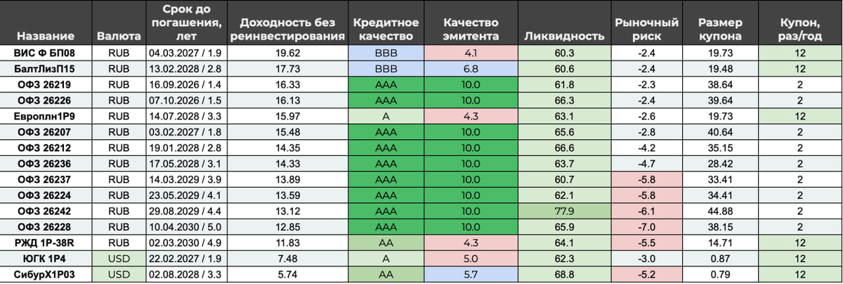 — С приемлемым рыночным риском — этот столбец показывает, на сколько процентов упадёт цена облигации при росте ставки на 2% (для RUB) и 1% (для USD) Параметры, на которые следует обратить внимание, выделены цветом. 3. Подборка подготовлена с помощью сервиса Доход.