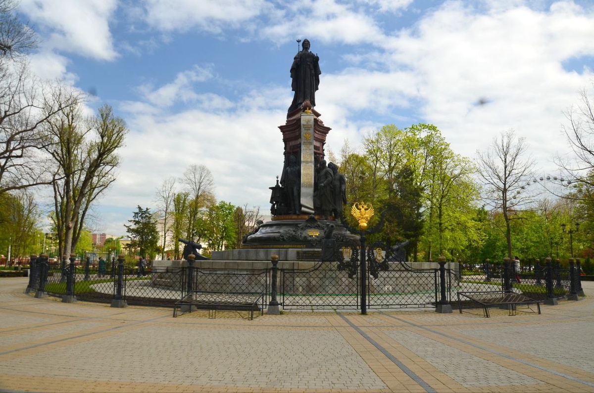 Очень красивое название было у Краснодара до революции - Екатеринодар. И памятник, посвящённый Екатерине II и этому событию стоял прекрасный. Архитектора Микешина работа, он же памятник "Тысячелетие России" в Великом Новгороде создал. Тот не был разрушен после революции, хотя и сильно пострадал после войны, а краснодарский снесли уже в 1920 В 2006 его восстановили по старым чертежам. На памятнике изображена императрица и та самая Жалованная Грамота, по которой казакам, служившим и живущим здесь, на вечное владение передавалась кубанская земля, ограниченная рекой Кубанью и Азовским морем, а с востока условной линией от устья Лабы до Ейского городка. Окружают императрицу Потемкин-Таврический, атаманы Черноморского казачьего войска, а также слепой кобзарь и мальчик-поводырь. P.S. вспомнила, что должна быть фотка с классом у этого памятника, и нашла её! (Год примерно 2016-2017)))