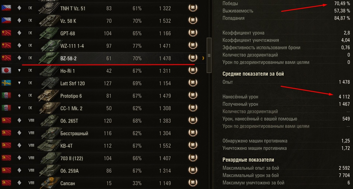 И вот очередные 3 отметки подошли к концу. В этот раз мне поддался китайский тяжелый танк 9-го уровня BZ-58-2. Брал я его вроде за 40 жетонов в специальном магазине Боевого пропуска, но, по-моему, не так давно разработчики обещали его убрать оттуда, и приобрести данную машину в рамках этого магазина будет уже нельзя. Этот танк мне нравится даже сейчас: в игре прост, обладает рядом приятных характеристик, от него сильно не подгорает да и ресурсов выложил за него всего ничего. По сути, больше минусов у BZ-58-2 особо то и нет. Конечно, при желании можно цепляться к броне: довольно крупная НЛД и снаряды, рикошетящие от башни, часто пробивают в крышку корпуса. Но такие негативные моменты можно найти практически у любой техники в Мире танков. Ради эксперимента установил новое оборудование "Многозубая каретка досылателя Т3" + по старинке добавил мою любимую турбину Т3 и трофейный стабилизатор. Такая сборка для китайца показала себя более чем хорошо. Вместо первого оборудования вы спокойно мо