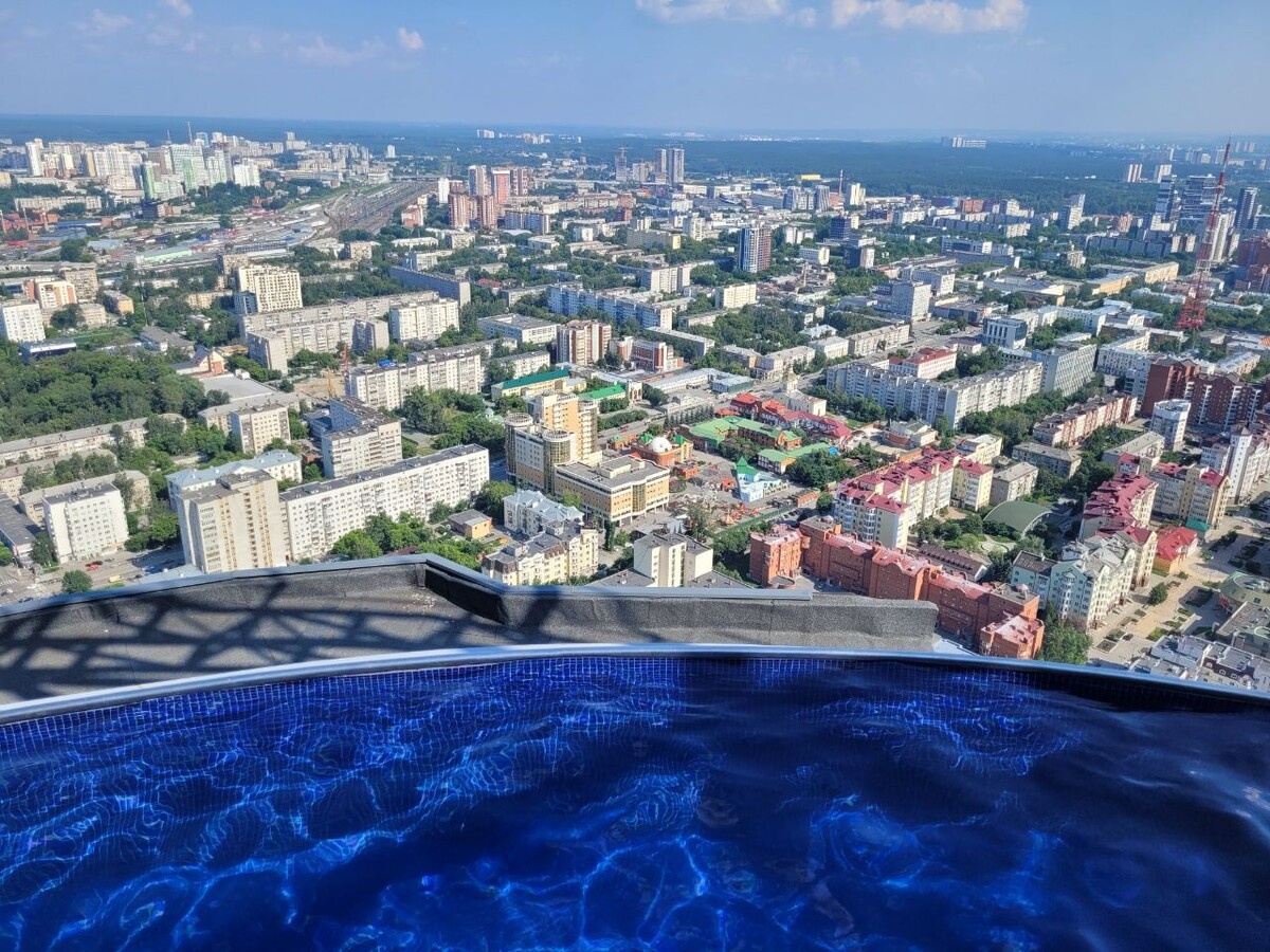 Sky infinity pool. Уникальный бассейн, расположенный на крыше небоскрёба, единственный в России. С высоты 197 метров открывается головокружительный вид на исторический и деловой центр Екатеринбурга. Sky infinity pool это два открытых подогреваемых бассейна "Южный" и "Западный", две панорамные сауны "Арома" и "Соляная", русская баня на дровах с панорамным видом на город и vip-комнаты для комфортного отдыха. Южный бассейн открывает вид на парковый район города Екатеринбурга, шарташский пруд. Длина бассейна составляет 11 метров, ширина 3 метра, глубина 1.30 метра. Западный бассейн открывает панораму на центр Екатеринбурга, площадь 1905 года и городской пруд. Длина бассейна составляет 20 метров, ширина 3 метра, глубина 1.30 метра. Влажная сауна, 54 этаж, температура 80-90°С только для гостей VIP SKY. Соляная сауна, 55 этаж, температура 80-90°С, доступна для всех. Арома-сауна, 56 этаж, температура 80-90°С. Доступна для всех. Семейный день. Каждую среду и воскресенье Sk